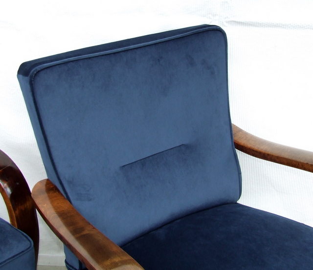 With a wonderful Art Deco design these armchairs have been fully restored, French polished and re-upholstered with a superb quality, silky soft, Royal blue velvet fabric. |