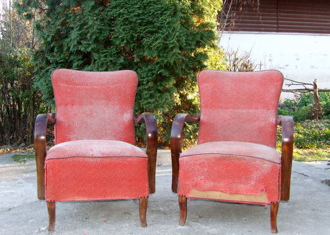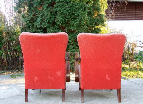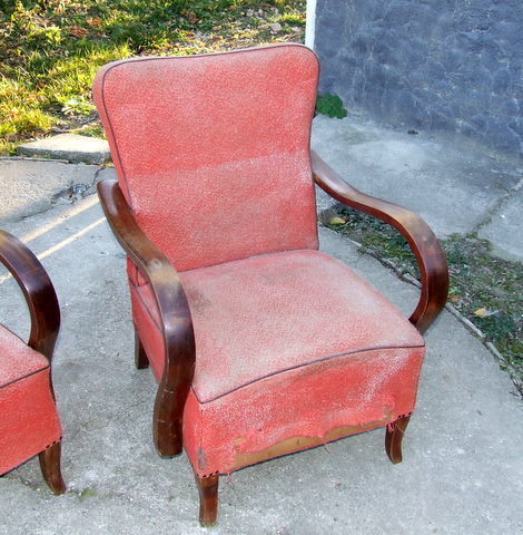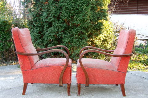 As you can see from the photos the upholstery is in a very used condition and would need re-covering or re-upholstery. An ideal project here for anyone taking an upholstery class or furniture retoration course at college or evening classes. If however you would like these armchairs restored and re-upholstered please do not hesitate to contact me (David) at info@hungary4deco.co.uk . The springs and webbing are still very strong though, making these art deco club chairs very comfortable to sit in. |