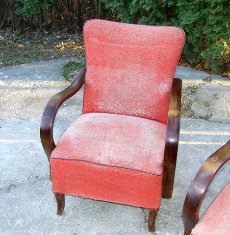 The beautifully steam bent curved arms on these club chairs are each made from solid walnut, they do have a slight wobble but the joints are all fine so they would be easy to re-glue during the upholstery process. The original polish is a bit faded and worn through in areas, especially on the tops of the arms where you would rest your elbows, but to maintain that antique look the arms could be revived with a few coats of new polish applied, or even just a good furniture wax polish. But again if you would like the arms and back legs fully restored and re-french polished prior to delivery to your own upholsterer then please do not hesitate to email me (David) at info@hungary4deco.co.uk . To see some 'Before' and 'After' photos of previous projects please click here.