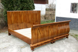 Art Deco walnut veneered 'Superking Size' double bed. Fully restored and French polished. With brand new slats fitted. Mattress size 180cm x 200cm. Click Here for more details. |